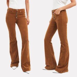 Veronica Beard Beverly 70s Retro Flare Cords Rust Brown Women's Size 27. Exposed button fly. 5-pocket styling. Belt loops. Stretch corduroy. Flared from the knee. Very hippie vibes! Long length. 98% cotton and 2% spandex. Made in the USA. Retails for $250 USD = approx $348 CAD. Very good pre-owned condition. No visible flaws.