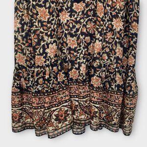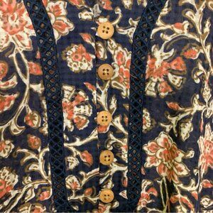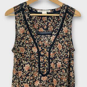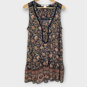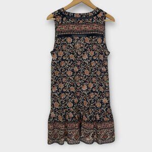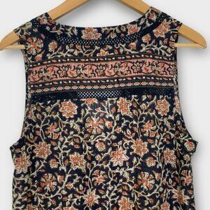 Sleeveless floral dress with deep V-neck. Features intricate patterns and a flowy skirt.