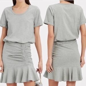 This stylish and comfortable Veronica Beard Jeans mini dress is crafted from ultra-soft Pima cotton and features classic navy and white stripes. Designed with a flattering ruched side detail and ruffled hem, this piece gives an effortlessly chic silhouette. The short sleeves and scoop neckline make it perfect for layering with a jacket or wearing solo during warmer seasons.