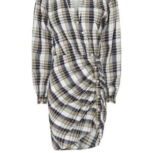 Blue & army green plaid, asymmetrical with button details. Features a ruched front with zipper & button closure.