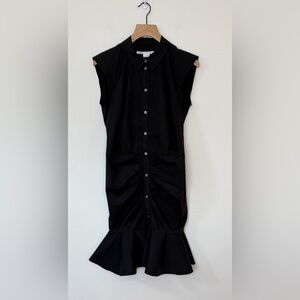 An unexpected update on a classic shirtdress silhouette. This Veronica Beard dress is crafted in crisp poplin and features ruching and a ruffled hem for a charming feel.
