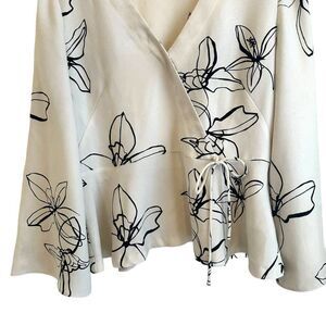In excellent condition Veronika Maine ivory with black floral blouse. A v-neck with a faux wrap effect and gorgeous bell sleeves. This is a great blouse for the office or to wear for a night out. Side zipper closure. Veronika Maine is an Australian brand that is known for technical innovation and high quality finishes. Care tag has been removed, so I am not sure of the fabric content but the designer uses a lot of viscose and tops usually retail for around $175 CAD or $200 AUD. Australian size 16 which equates to a US Size 12. Flat lay measurements: 21" pit to pit, 23" length.