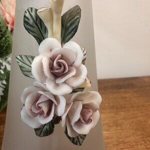 This tall and elegant frosted glass bottle features a flared genie-style silhouette with beautifully embossed floral designs, including delicate blooms and leafy accents that wrap around the base. Likely produced by French glassmaker Verreries de l’Est in the mid-20th century, this piece may have originally held bath oil or bubble bath, but today it shines as a striking decorative piece. At 32 cm tall, it’s the perfect vintage accent for boho, romantic, or mid-century modern décor.