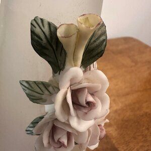 Likely made by Verreries de l’Est, this oversized frosted glass bottle features embossed flowers and leaves, giving it a dreamy, botanical charm.