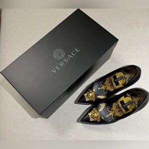 Elegant loafers with bold gold accents. Luxurious design by Versace. Perfect for stylish occasions.