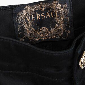 From Versace, these Black Diamond Medusa Jeans feature a unique diamond encrusted buttons and rivets surrounding the iconic Medusa logo. Made with the highest quality stretch cotton blend, these jeans offer both style and comfort for a luxurious fashion statement. Elevate your wardrobe with these statement-making jeans.