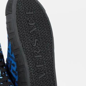These high-top canvas sneakers from Versace in tones of blues feature the iconic Greca print allover, black leather trims, a front lace-up closure, a padded tongue, a Medusa head logo on the sides, a black rubber round cap toe, and the Greca pattern at the black rubber midsole.
