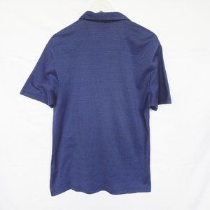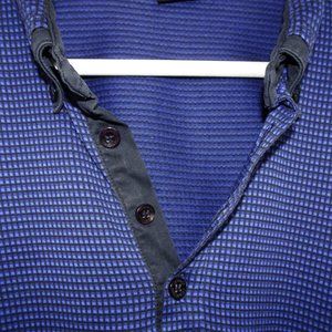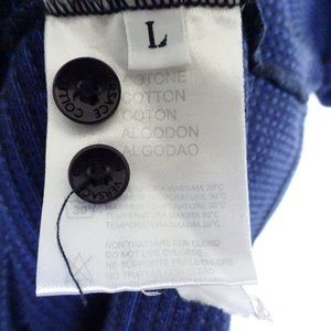 small holes on the bottom front left corner and in the back on one of the sleeves, black fabric around collar has some color fading, faint stain on the front left upper