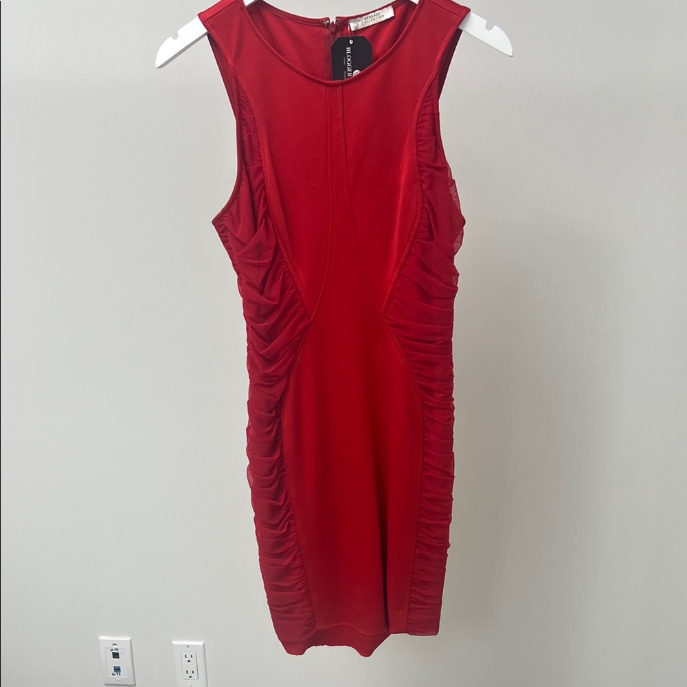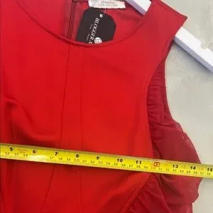 Chic red mini dress with ruched sides. Sleeveless design. Perfect for stylish outings. **some unidentified residue on the midsection, per pics. Otherwise excellent condition