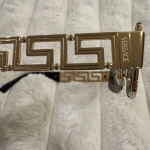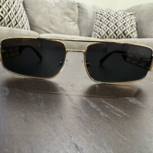 Stylish rectangular sunglasses with gold frames and dark lenses. Perfect for a chic look. Versace framed unisex