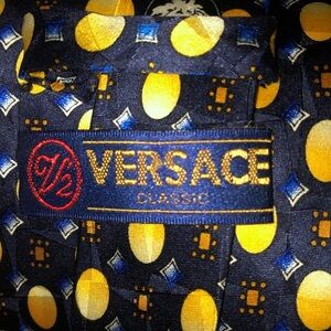 Elevate your style with this exquisite Versace tie, showcasing a harmonious blend of gold and blue tones. Crafted from luxurious silk, it offers a smooth texture and a refined appearance. Perfect for adding a touch of elegance to any formal occasion.