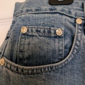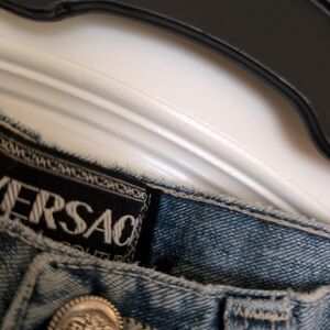 Stylish denim featuring a black leather patch with Versace Jeans Couture logo. Perfect for a chic look.