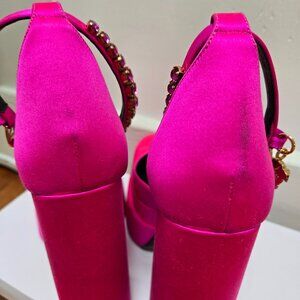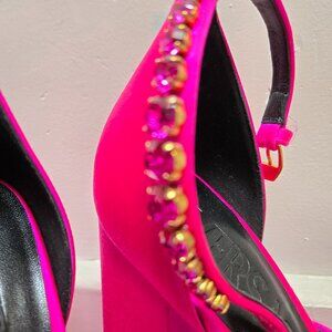 Step into iconic Italian glamour with these Versace Medusa Head Charm Platform Sandals in show-stopping hot pink fuchsia. Crafted in Italy from a luxe satin and viscose blend, these heels feature sparkling crystal embellishments and the signature gold-toned Medusa charm, adding unmistakable Versace attitude.