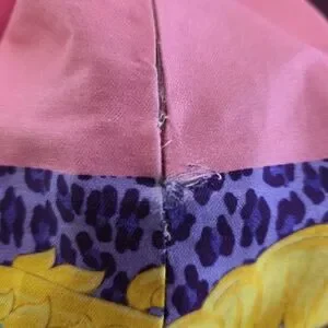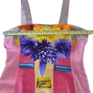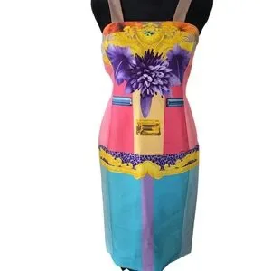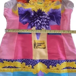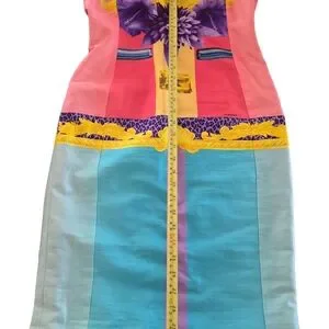 Vibrant mini dress with bold patterns. Features pink, yellow, purple, and blue hues. lined. loose threads nited bottom of side zip. Eye-catching design by Versace.