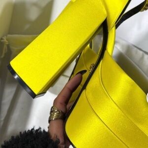 Versace stunning Neon Yellow Satin Platform Heels. Ankle strap with embellished detail. Thick block heel. Box included.