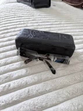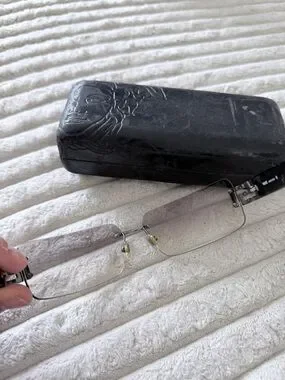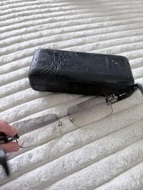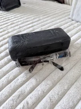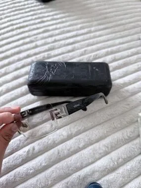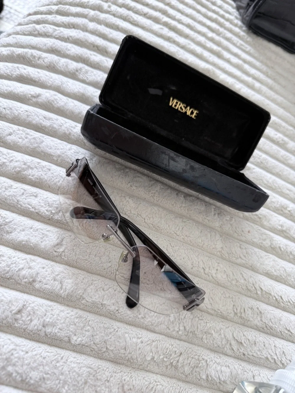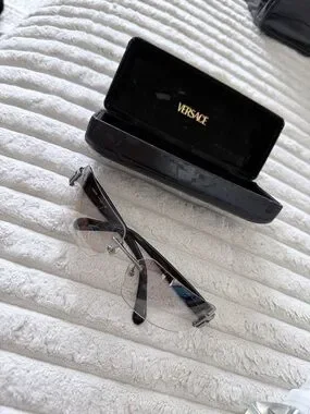 Designer Versace rimless sunglasses. Sleek black temples with silver-tone hardware. Clear gradient lenses. Includes branded Versace case visible in image.