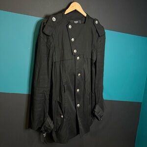 Chic black trench coat by Gianni Versace. Features button details and sleek design. Perfect for stylish outings.