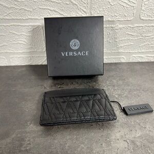 Versace Black Leather Virtus Card Holder. 5 card slots. Gold-tone hardware. Tonal stitching.