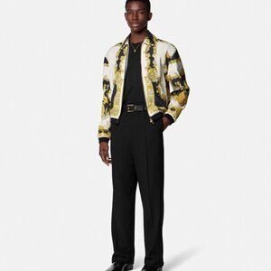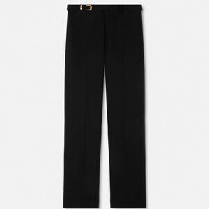 These formal pants in crêpe wool blend feature an attached Heritage belt at the waist, and a tonal jacquard Versace tailoring label at the back.