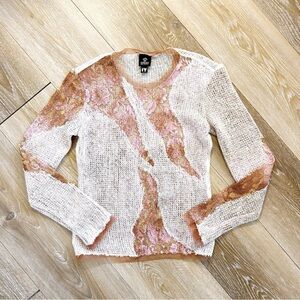 Step into iconic Y2K style with this rare Versace Vintage Sheer Knit Lace Sweater in a dreamy cream and rose colorway. This statement piece features an asymmetrical cut-out design with floral-patterned lace in varying tones, creating a striking, romantic look that’s both delicate and bold.