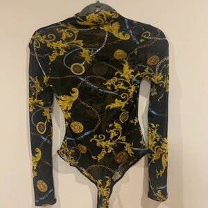Versace-inspired sheer mock neck mesh bodysuit with yellow/gold and blue details. Thong style bodysuit. Excellent condition. Purchased from Simons.