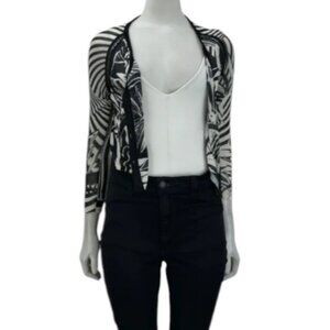 A Versace floral button-up cardigan, in pink and cream color. Features long sleeves and a V-neckline, secured by gold-toned buttons down the front. The design incorporates both broad stripes and intricate leaf patterns. Pair with high-waisted denim shorts or jeans and a simple white tank top for a relaxed yet stylish look.