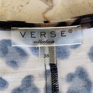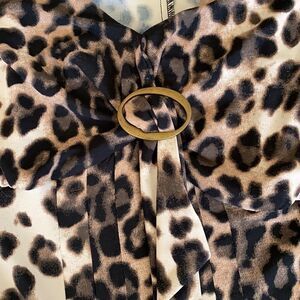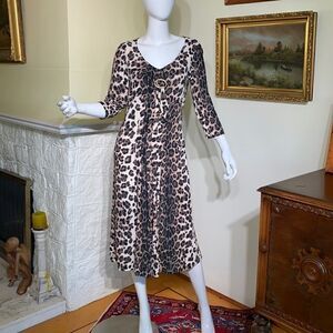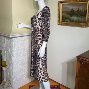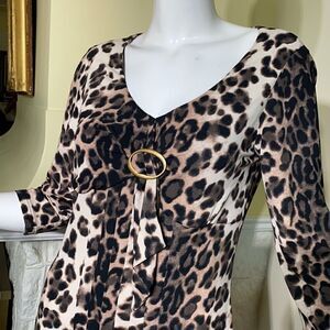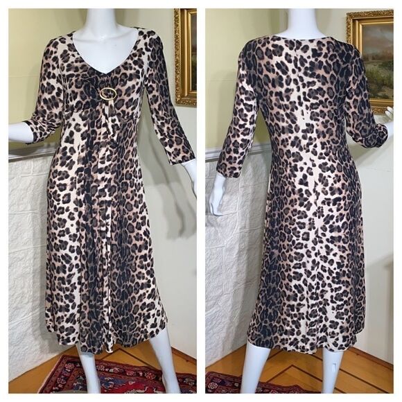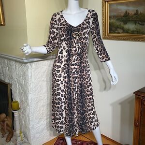 In excellent preowned condition classic Verse animal print midi length dress, comfortable stretch fabric, 2/4 length sleeves, v neck with flattering chest buckle detail and pleating.