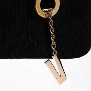From Italy for the 2018 Pre-Fall and Winter collection comes this rib knit black sweater from Versace's Versus line featuring a round neckline, long drop sleeves with slight puffing at the elbow, and a gold-tone ring at the hem from which a removable 'V' letter charm hangs from a chain.