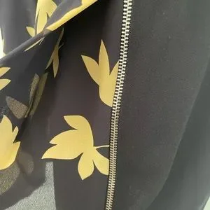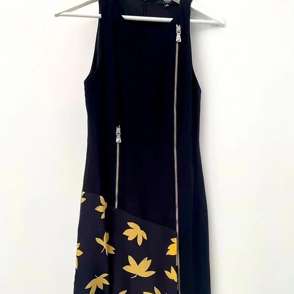 Versus brand new dress. Sleeveless sheath dress detailed with crew neck, two front zips and Leaves printed insert at asymmetric hem. Concealed rear zip closure.