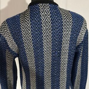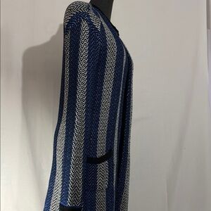 Stylish blue and white and black striped sweater coat with front pockets. Perfect for layering. Some stretch to fabric for additional comfort.