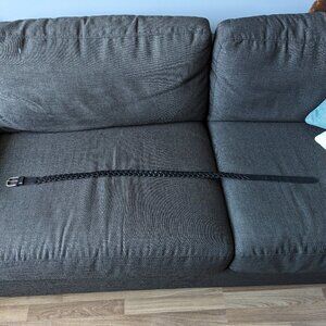 This very dark brown braided belt is almost black. Made of genuine leather with matte silver toned hardware. Unisex sizing. See photos for measurements.