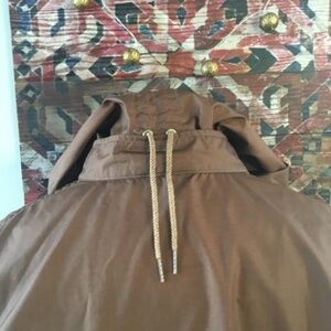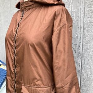 Very rare, Vintage Mighty Mac Pelt Belt Windbreaker. Gorgeous brown/bronze color. All the hardware- zippers, buttons, etc. excellent working condition. They do not make clothing like this anymore. All the details are incredible- the drawstrings at the back of the hood to tighten and the ones in front to secure the hood- great design. Transforms to waist/belt and all the hardware is perfect. p-p 22". length 26 " Unisex
