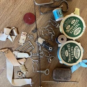 this came out of the drawer of a cabinet hosted old ornate Singer, Vintage seam binding, wood thread spools , 2 metal bobbins, a lot of old fashoned nylon tights fasterners, and even a hat pin!