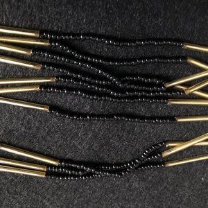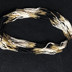 It is a very long multi-strand necklace, with white, black, and brown beads, and in very good pre-owned condition.
