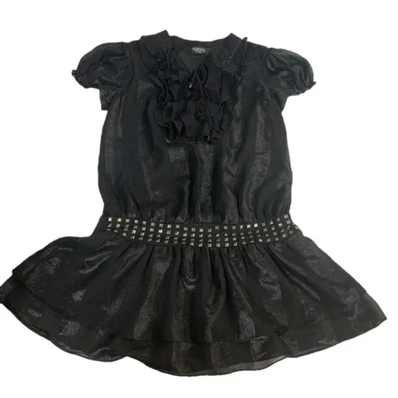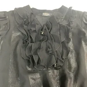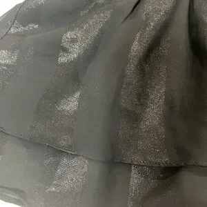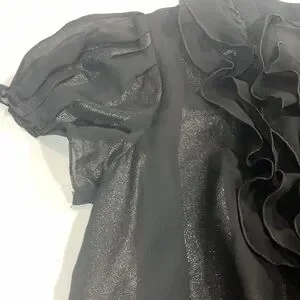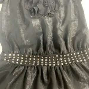 Super cute black ruffled blouse at the top has a tie, beautiful waistband with studs has a silver shimmer to the fabric