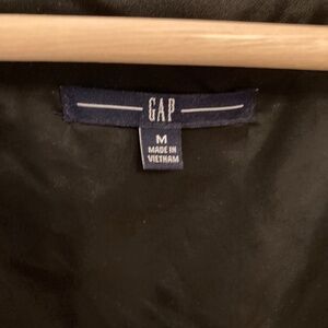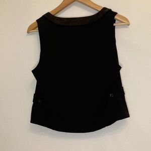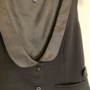Black satin trimmed vest. Low neckline with satin shawl collar. Fitted. Four buttons at the from and button details on the side. Tiny pockets. Fully lined. 20” from the shoulder to the points on the front. Back length 18.5”.