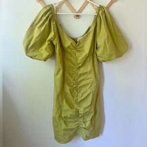 This stylish green dress features trendy puff sleeves and a flattering ruched design. Perfect for any occasion, it adds a touch of elegance to your wardrobe.