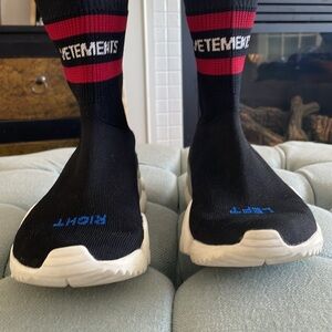 Vetements X Reebok black pull on sock sneakers with blue, white and red accent colours, white and grey outsoles. Men’s size 6. I wear a women’s size 8 and these fit me very comfortably! Very good used condition with some signs of wear. Wear/marks to outsoles, some fraying in the material on the left shoe near the heel (photos) a couple of light snags in the material on both shoes. No box, no dust bag, no card, no receipt. Please see photos, measurements are for reference only. Reasonable offers welcome!