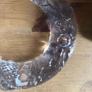 Made in Italy by Vetreria Etrusca. Heavy pressed glass wreath with details of leaves, berries and pine cones. Holds 5 taper candles.