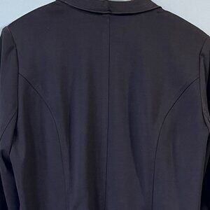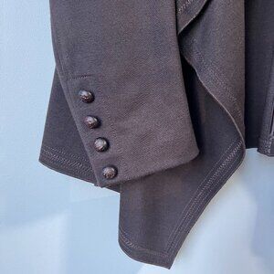 In perfect condition! Vintage business Blazer with a twist. Fitted in the back and longer open front panels with pleats from the collar. It has 4 buttons cuff, no pockets and 80' shoulder pads. The fabric tag has been removed, since this is stretchy it has definitely Spandex in it. It's not wool or cotton.