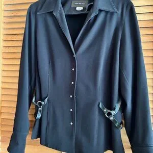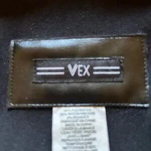 Vex is a high-end contemporary sportswear collection for women. Since the introduction of the brand, the Vex name has become synonymous with quality, fit and sophistication. This sweet jacket is black,medium sized with faux leather belting on the sides. Silver snap closures complete the look. Very comfy and rarely worn so in excellent shape.