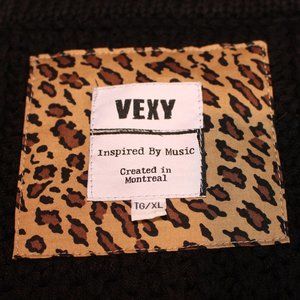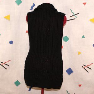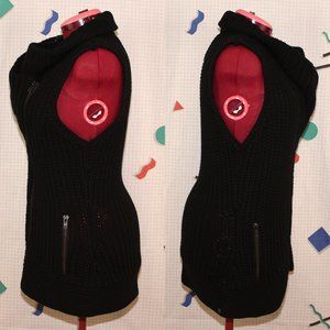 Black knitted sleeveless vest from Vexy. Made in China. Asymmetrical zipper+button closure. Has a small snag at the edge of the collar. Never worn, washed once. 50% cotton/50%polyester. Measurements zipped up flat are 16½"(33") bust, 17½"(35") waist, and 19"(38") hips. Material has a 35% stretch limit. More measurement available on demand. It also has pocket big enough to fit your hands. Comes from a smoke-free home that has cats and dogs. Tags: goth, punk, y2k, metal, clubbing