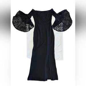 Black Longsleeve maxi with lace flutter sleeve drop shoulder off centre zippered slit side zipper closure elastic shoulder very good stretch available