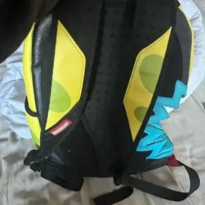 Eye-catching backpack with bold yellow and black design. Features blue and red accents for a striking look.