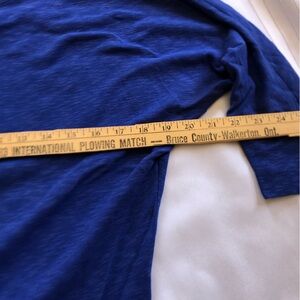Stylish mid length sleeve top in a vibrant blue color. Perfect for casual wear or to the office with a cardigan. The fabric makes it look fancy but it is basically a tee shirt material. Very soft. Batwing sort of design.