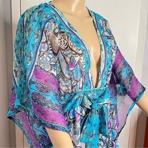 Elevate your beach style with this vibrant sheer blue turquoise and purple swim cover-up. Perfect for adding a splash of color to your swimwear collection.