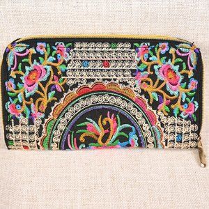 This clutch features intricate embroidery in blue and pink, creating a stunning floral and geometric design. The traditional needlework adds a rich texture to the fabric, making it a standout accessory for any occasion. Its compact size and wristlet style offer both elegance and convenience.