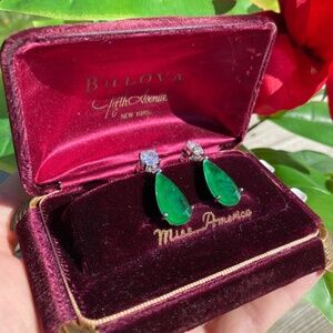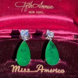Vibrant Green Lab-Created Emerald Dangle and Drop Earrings. Made with 925 Sterling Silver, these Victorian-style earrings are inspired by famous pieces worn by royalty and Hollywood celebrities. The emerald gemstone adds a touch of elegance and is a beautiful May birthstone. Available for pick-up at the Centerpoint library. A stunning and timeless gift option.