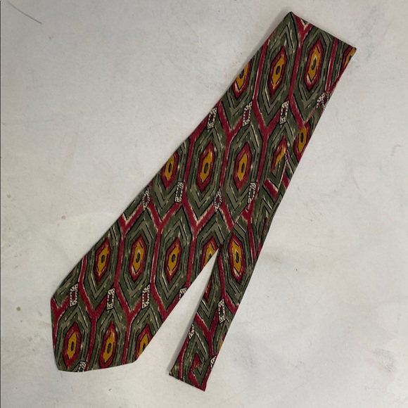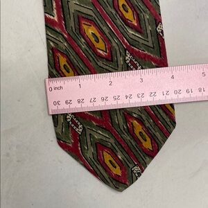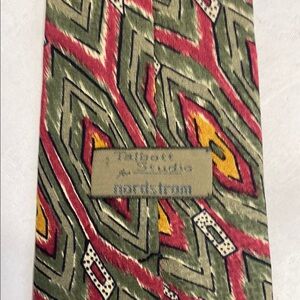 This striking tie showcases a vibrant ikat pattern in green and red, making it a standout accessory. Its intricate design and bold colors add a touch of sophistication to any ensemble. Perfect for those looking to make a statement with their attire.