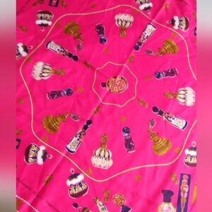 Hot pink scarf featuring vintage perfume bottles.